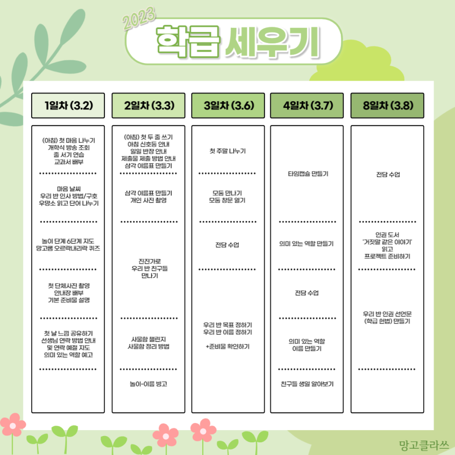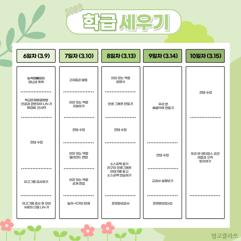 지난 2023 학급 교육 목표에 따른 학급 세우기 활동들을 일별로 고르게 배치해보았다.